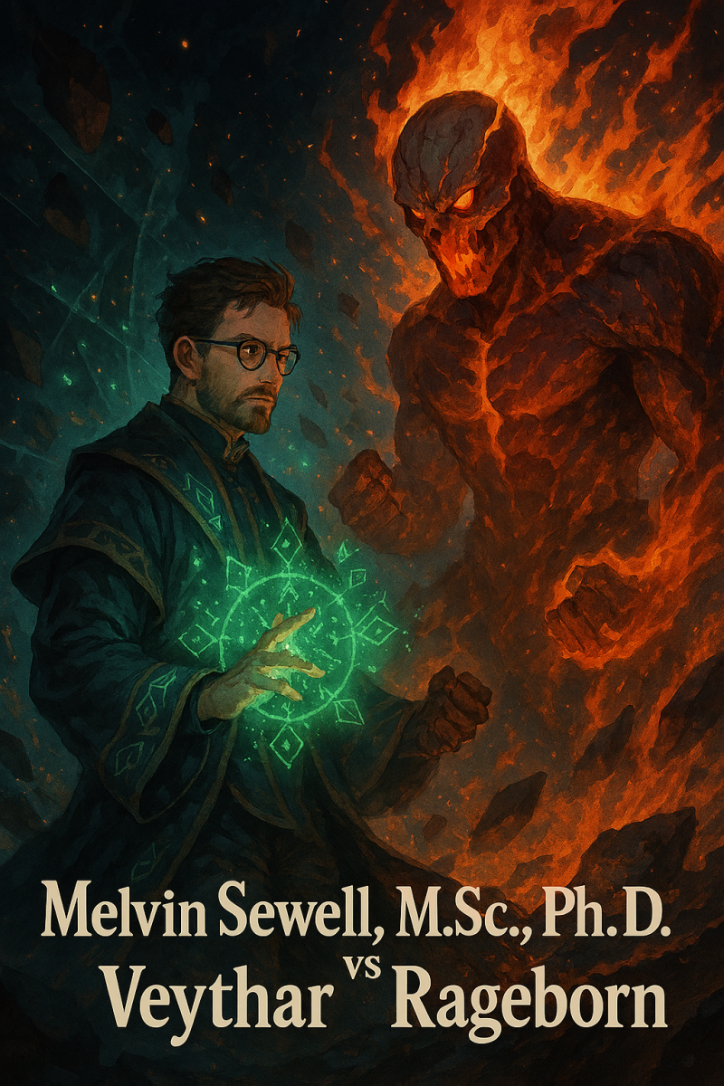 👓 Melvin Sewell stands firm in his scholarly mastery, wielding runes and radiant orbs of logic. 🔥 Veythar burns with chaos incarnate, his cracked mask and molten form tearing through dimensions. 🌌 A sovereign showdown where cosmic precision meets reality-breaking wrath.